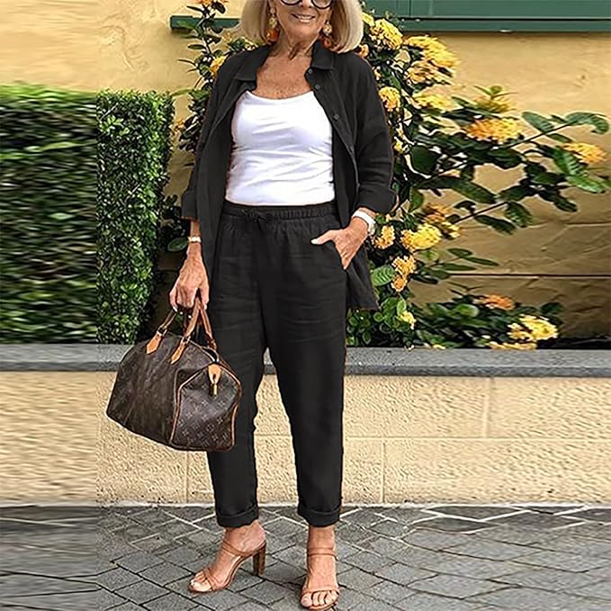 Scarlett™ - Comfortable Long Sleeve Blouse And Pants Set - Elevate your wardrobe with this modern and versatile set. Made from a premium cotton and linen blend, it ensures exceptional comfort and breathability for all-day wear. The classic button-up blouse and matching trousers with an elasticated waistband make it perfect for any occasion.